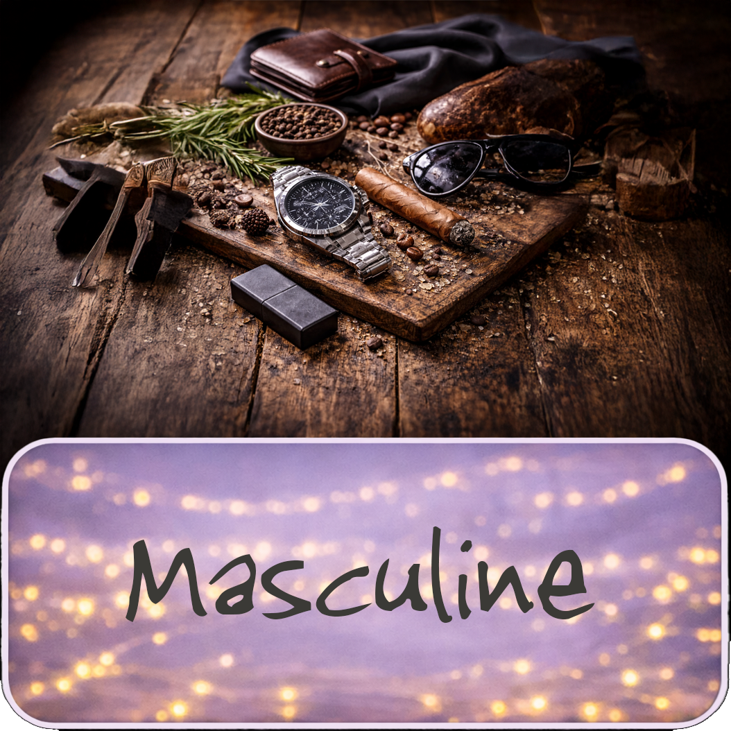 Masculine fragrances are steady, refined, and quietly confident. They feature rich woods, smooth leather, warm amber, and aromatic herbs that feel timeless and inviting. These scents are strong without being heavy, creating a warm, grounded atmosphere that feels classic and comforting.